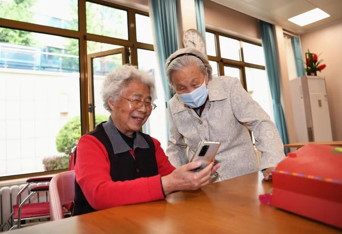 老人在位于河北三河的燕达金色年华健康养护中心老年活动室交谈(2022年5月18日摄)。