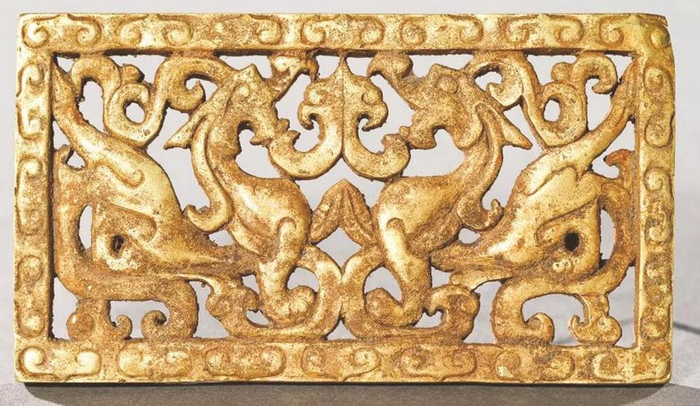 在这件文物的边框上,有一圈细细的卷云纹。最显眼的部分,是框内的两条透雕镂空、相向对称夔龙。据《山海经》记载,“夔”是一种有特殊能力的神兽,黄帝用它的皮作鼓面,鼓声能传到五百里之外,以此来震慑天下。到了后世,人们逐渐称之为“夔龙”。商周时期出土的青铜器上,经常可以见到夔龙纹。夔龙纹张口、卷尾,呈S形弧线,具有古拙的美感。我们在牌饰上见到的这两条夔龙,非常典型。它们昂首张口,作腾空而起的姿势,很像《周易》里爻辞所描写的“飞龙在天”。