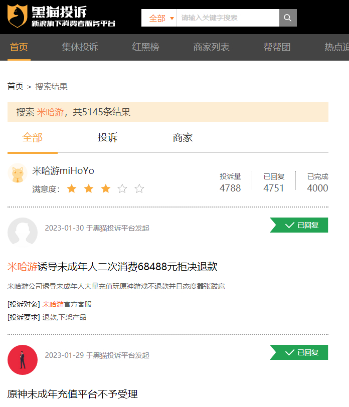 2月27日,记者在黑猫投诉平台上发现,有关米哈游的投诉量高达4788件,仅最近30天的投诉就有251件,最近30天已完成的只有20件,完成率不到10%。其中,未成年人充值退费难是投诉的主要问题。有网友反映“米哈游诱导未成年人二次消费68488元拒绝退款”“原神未成年充值平台不予受理”等。记者以“米哈游+退款”“米哈游+未成年”为关键字在黑猫投诉上进行搜索,分别显示出1081条和769条相关投诉。