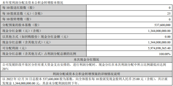 同花顺拟以2022年12月31日总股本5.38亿股为基数,向全体股东每10股派发现金股利人民币25.00元(含税),共计派发现金13.44亿元,其余未分配利润结转下年。