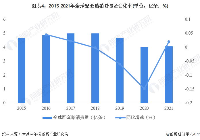 2015-2021年全球原厂配套轮胎市场消费量整体表现稳定,由于全球疫情逐步受控,2021年全球配套轮胎市场消费量达到4.07亿条,同比增长2.01%。