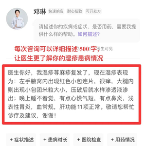很多人可能不会判断自己的湿疹病情到底处在哪个阶段,担心胡乱用药没效。这时候,你只需要线上拍照上传,描述问题和诉求,即可收到专业医生回复,沟通顺畅感蹭蹭上升。