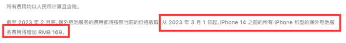 据苹果官网信息,从2023年3月1日起,iPhone 14之前的所有iPhone机型的保外电池服务费用将增加169元。另外iPad和MacBook Air的一些机型保外电池服务费用也将增加,从149元到480元不等。