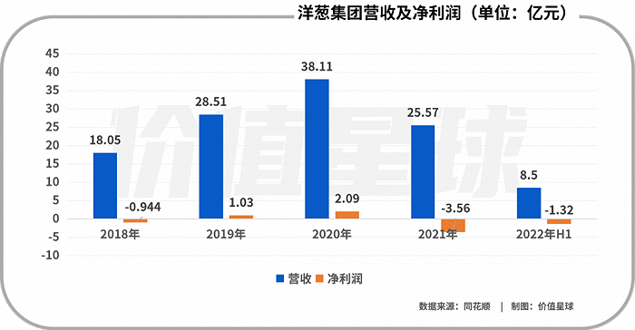 转折出现在2021年,这一年洋葱集团营收25.57亿元,同比下降32.9%。并且大幅亏损,净利润-3.56亿元,同比下降269.9%。
