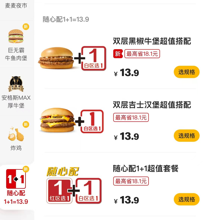 麦当劳“1+1随心配”套餐。