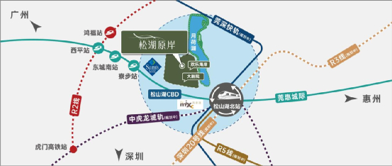轨道交通:项目背靠5轨(R3线、莞惠城轨、莞深快轨、中虎龙城际、深圳13号线北延长线)交汇的松山湖北站,华侨城松湖原岸距离松山湖北站约800米,松山湖北站为松山湖重要交通枢纽,与深圳、广州、惠州等地无缝衔接,比肩深圳北站。