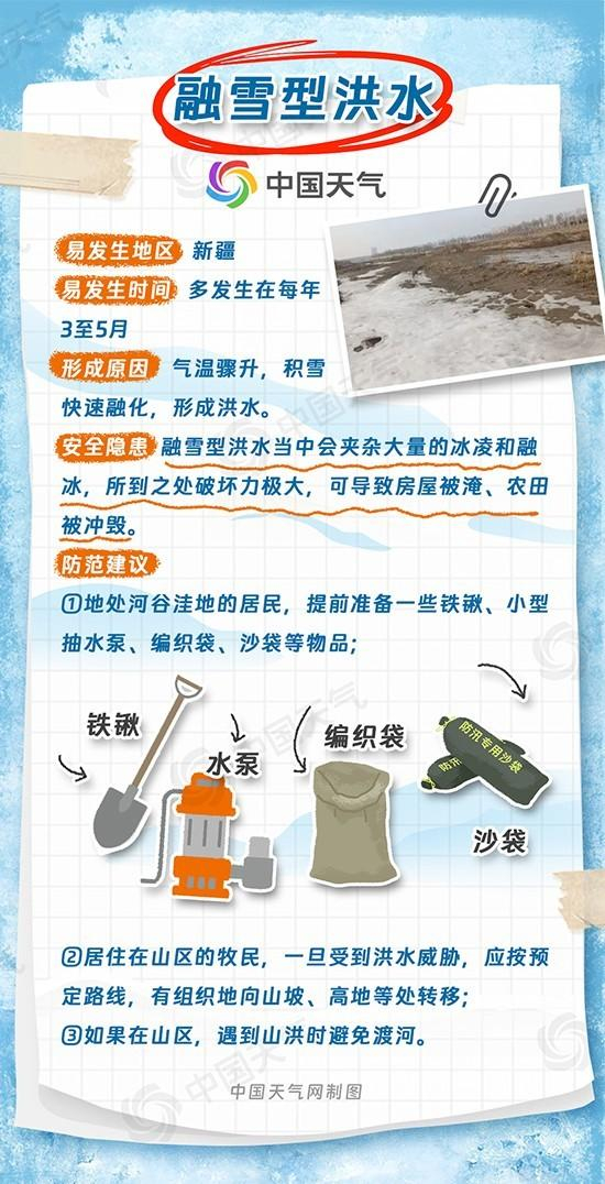 和普通洪水不同的是,融雪型洪水当中会夹杂大量的冰凌和融冰,所到之处,带来的破坏也极大。在防范措施方面,建议气温大幅回升时,地处河谷洼地的居民,提前准备一些铁锹、小型抽水泵、编织袋、沙袋等物品;居住在山区的牧民,一旦受到洪水威胁,应按预定路线,有组织地向山坡、高地等处转移;如果在山区,遇到山洪来袭时千万不要渡河,以免被洪水冲走,危及生命。