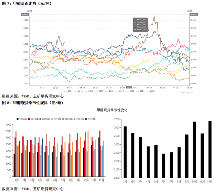 4、春节后2月到5月底库存的去化:这段时间甲醇开始进入春季检修,开工率逐渐下滑,而传统需求在春节之后开始逐渐恢复。供减需增库存去化。
