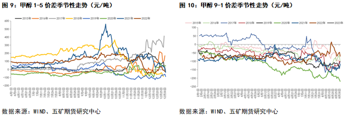 09合约对应甲醇的季节性累库阶段,需求淡季,一般月差在高库存压制下难以大幅走高,9-1价差以反套为主。09合约一般在7月中下旬之后开始移仓到01合约,到8月中旬之后一般主力会切换到01合约。在移仓换月的时候一般是反套走得最流畅的时候。而在主力合约为切换到09之前,也就是1-4月份的时候,盘面价差一般以区间震荡为主。