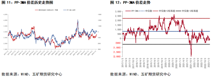 3、PP-3MA价差修复的方法:1、甲醇价格下跌幅度大于PP(出现概率大)。2、PP上涨幅度大于甲醇。