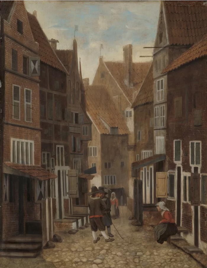 时间的先后在此很重要,时间也解释了为什么弗雷尔的作品对当下的我们没有那么大的吸引力。 他的问题与许多先驱者一样——被后来者超越。 不仅是维米尔,超越他的还包括了彼得·德·霍赫、扬·范德尔·海登(1637—1712)等。熟悉荷兰黄金时代风格的人可能不会感到弗雷尔的特别之处。尤其是对城市景观的描绘,维米尔笔下的城市如幻想般温暖而优美,但弗雷尔似乎还不太会运用光,即使是湛蓝的天空,也仿佛大雨将至。