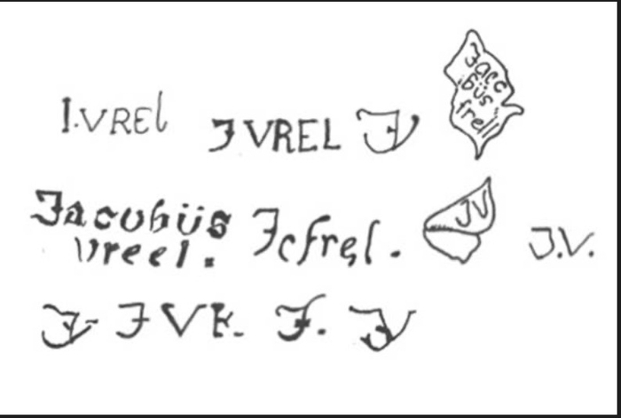 因为弗雷尔再没有其他生平资料,不少对他的研究基于其作品上的签名,这也是他作品的标志性特征。弗雷尔约三分之二带有白底签名,他可能将这些签名视为自己的“商标”。研究显示他曾用过多个版本班名,包括 J V、J Vrel、Jacobus Vreelle 和 Jaco/büs/frell。