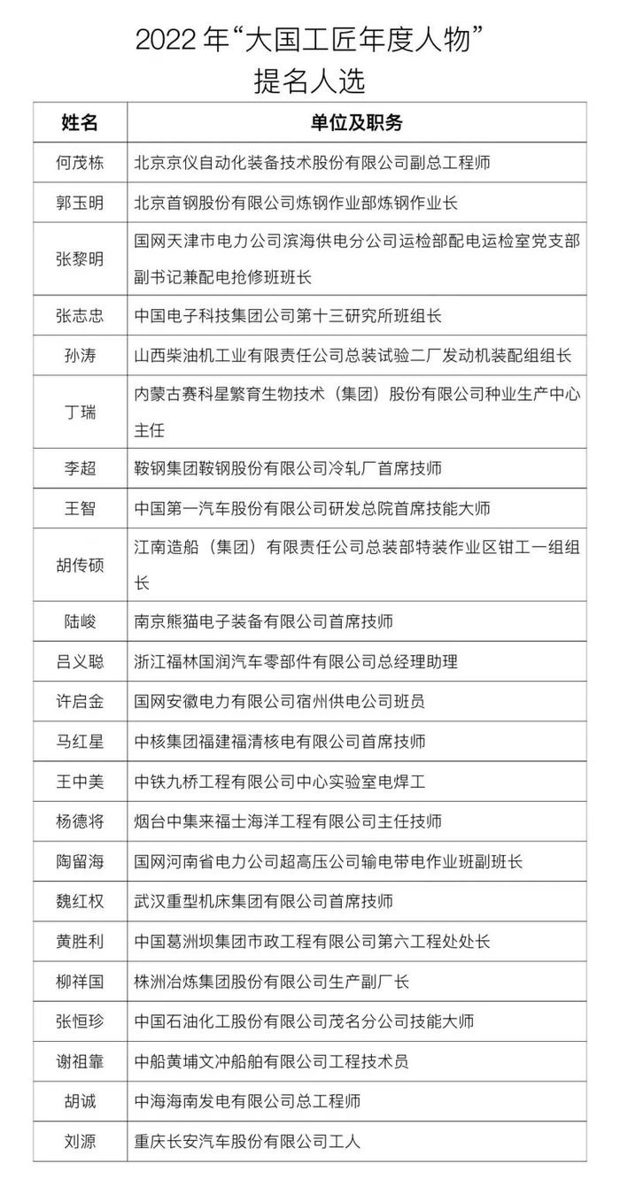 为深入学习贯彻党的二十大精神,大力弘扬劳模精神、劳动精神、工匠精神,团结引领广大职工群众在全面建设社会主义现代化国家中发挥主力军作用,由中华全国总工会、中央广播电视总台联合举办的2022年“大国工匠年度人物”发布活动,2月28日在江苏省南京市揭晓评选结果。