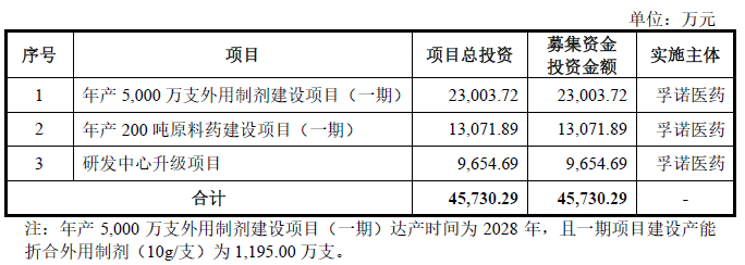 孚诺医药的募投项目如下图所示: