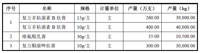 据招股书,发行人年产5,000万支外用制剂项目中的外用制剂是指复方多粘菌素B软膏、维氟醌乳膏和复方酮康唑软膏这三种产品,预计T+3年投产,2028年达产。项目达产后预计产能如下图: