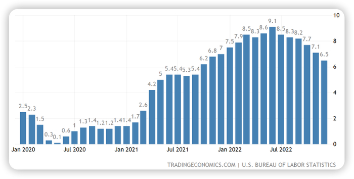 ▼ 美国通胀率曲线图(2020.1-2022.12)