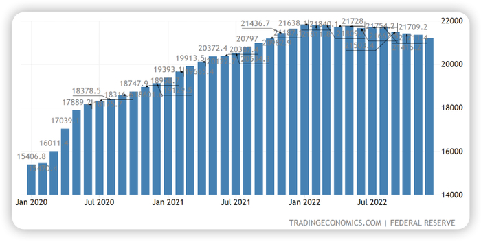 ▼ 美国货币供给M0曲线图(2020.1-2022.12)(单位:10亿美元)