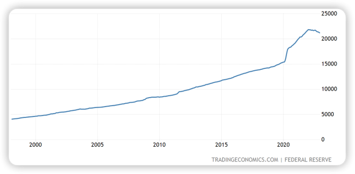 ▼ 美国货币供给M0曲线图(1998.1-2022.12)(单位:10亿美元)