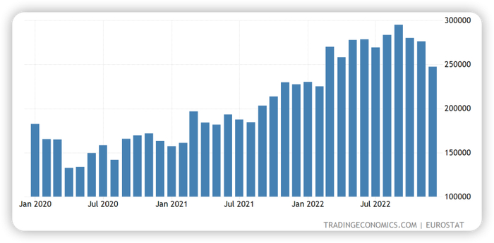 全球第二大顺差国德国则降到了794.5亿欧元,由于2022年欧元对美元波动较大,姑且把它算作约合800亿美元(2021年2289亿,2020年2211亿)。德国顺差爆降,主要是由于俄乌战争导致的能源价格过山车,德国在战前对俄国能源依赖度过大所致。