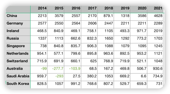 从2021年的排名中可以看到,顺差国分几种,中、德、韩(2022转为逆差),这三家是生产国,但三国并非同生态位竞争,中国是中低端,德、韩都是高端;俄(2022被剔除排名)、澳、沙,这三家是资源国;新加坡是转口港,荷兰、爱尔兰和瑞士也都有大规模的转口贸易,爱、瑞还是偏科生,仅从出口来说,爱尔兰的前四大品类,药品占34%,有机化学占19%,光学及医疗器械占8.7%,机器占5%,合计超三分之二,瑞士的前四大品类,珠宝占30%,药品占24%,有机化学占7.7%,光学及医疗器械占4.8%,合计超三分之二(爱、瑞的分科数据来自https://tradingeconomics.com/)。