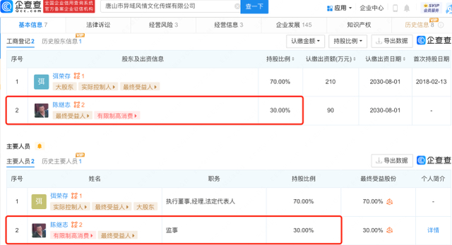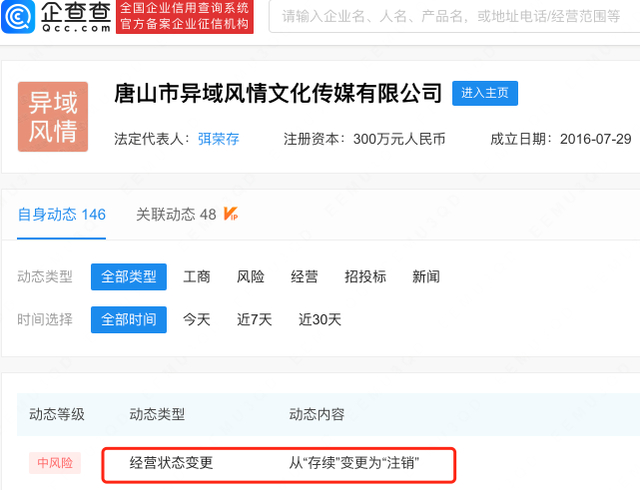 2月15日,据企查查APP显示,唐山市异域风情文化传媒有限公司经营状态由存续变更为注销,注销原因为决议解散。企查查信息显示,该公司成立于2016年,注册资本300万元人民币,由陈继志持股30%并担任监事职位。目前,陈继志名下关联的2家公司均已被注销或吊销。