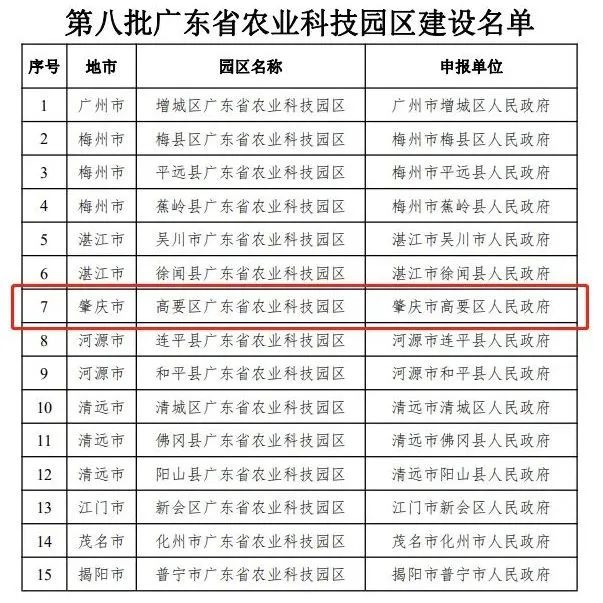 第八批广东省农业科技园区建设名单,