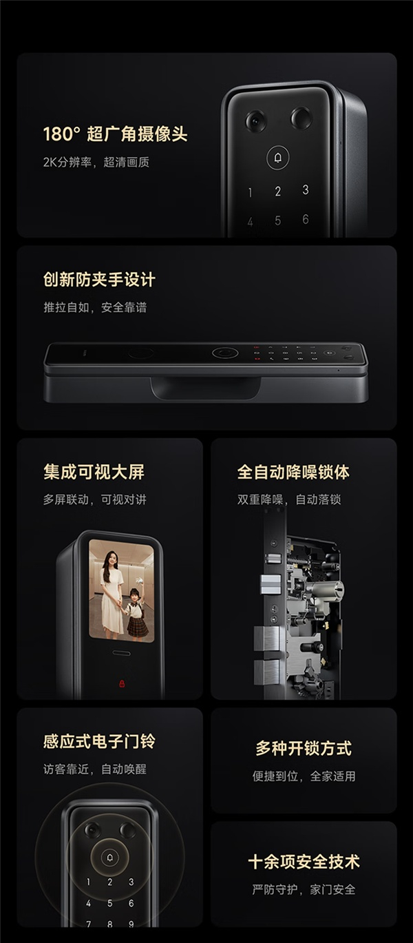 其他方面,这款门锁还采用了创新防夹手设计、全自动降噪锁体,支持自动落锁,配备感应式电子门铃,提供多种开锁方式,还支持十余种安全技术。