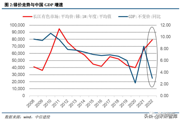 锑下游主要应用于阻燃剂领域,而阻燃剂需求与中国宏观经济增速关联较为紧密,2021 年之前锑价与中国 GDP 增速拟合程度较高(2010-2011 年受锑矿开采总量控制等因素影响而有所背离)。2022 年锑价与中国 GDP 增速出现了背离,我们认为锑价逆势上涨或是由于锑的“光伏金属”属性影响所导致。