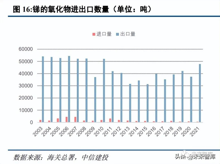 根据海关总署数据,中国主要锑产品中,锑的氧化物、硫化锑、未锻轧锑以出口为主;2021 年中国锑的氧 化物出口量为 4.8 万吨,较 2020 年上升 28%;硫化锑出口量已下降至较低水平;未锻轧锑近年来出口量有所增 加,2021 年出口量为 1.1 万吨,较 2020 年上升 39%;我国锑深加工产品特别是高纯氧化锑在内的深加工产品的 比重逐渐提高,锑品结构继续向深加工方向延伸。“其他锑矿砂及其精矿”海关编码为“26171090”。