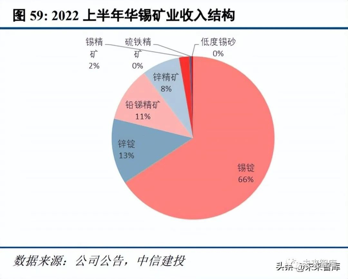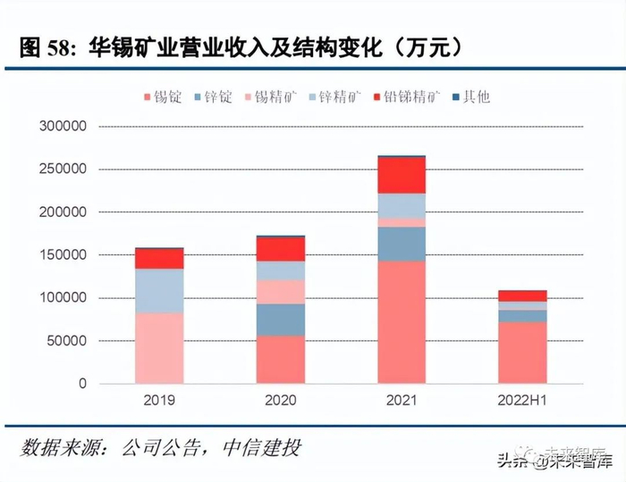 华锡矿业经营概况。2019-2021 年华锡矿业主要产品营业收入分别为 15.9 亿元、17.3 亿元、26.6 亿元,年均复合增长率为 29%。2022H1 主要产品营业收入为 10.9 亿元,从收入结构来看,(1)锡锭营收 7.1 亿元,营业收入占比 66%;(2)锌 锭营收 1.4 亿元,营业收入占比 13%;(3)铅锑精矿营收 1.2 亿元,营业收入占比 11%。