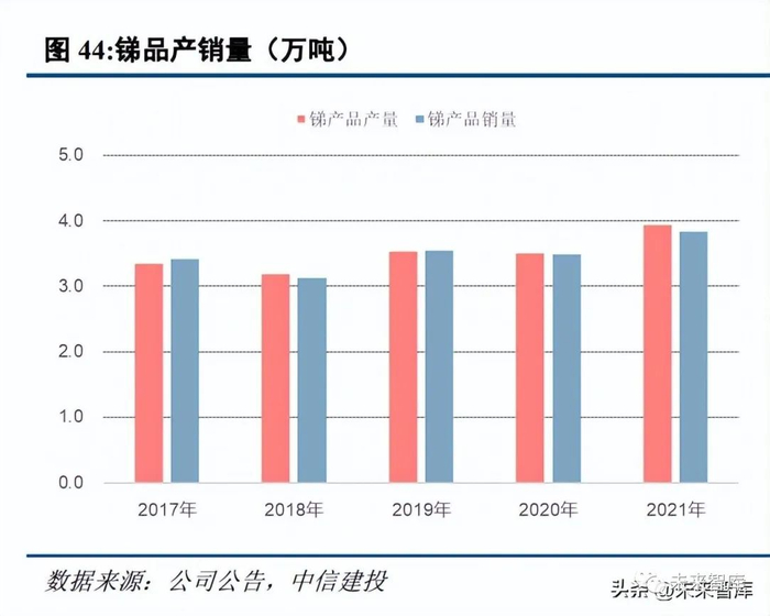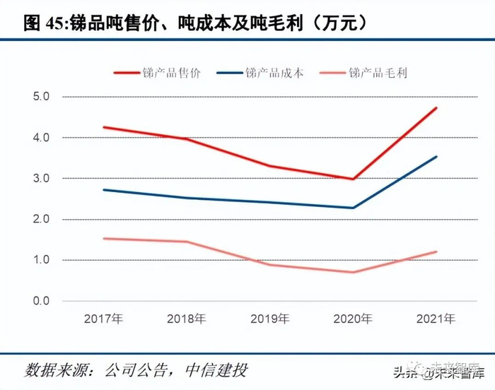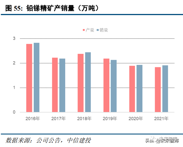 预计锑价上涨将带动公司盈利快速增长。2016 年公司铅锑精矿产量 2.38 万吨,2021 年下降至 2.12 万吨;2016 年公司铅锑精矿销量 2.83 万吨,2021 年下降至 1.91 万吨;2016 年铅锑精矿吨售价 1.68 万元,2021 年增 长至 2.26 万元,同比增长 35%;2016 年铅锑精矿吨成本 0.58 万元,2021 年增长至 0.91 万元,同比增长 58%;2016 年铅锑精矿吨毛利 1.10 万元,2021 年增长至 1.36 万元,同比增长 23%。