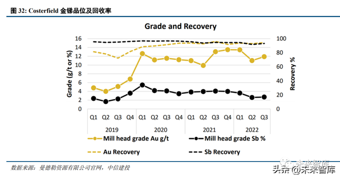 科斯特菲尔德(Costerfield)金锑矿由曼德勒资源有限公司所有和开发,锑储量约 1.78 万吨。2020-2022 年 科斯特菲尔德金锑矿锑金属产量分别为 3903、3380、2100-2700 吨,产量以及品位均呈现下行趋势。科斯特菲 尔德矿山的含金锑矿主要销售给湖南黄金。