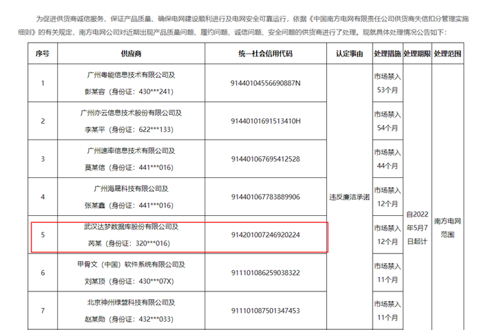 据南方电网2022年5月7日在供应链统一服务平台公示的南方电网供应商处理公告,南方电网对出现产品质量问题、履约问题、诚信问题、安全问题的供应商进行了处理,其中,达梦数据及芮某因违反廉洁承诺,在南方电网范围被市场禁入12个月,处理期限自2022年5月7日起计。