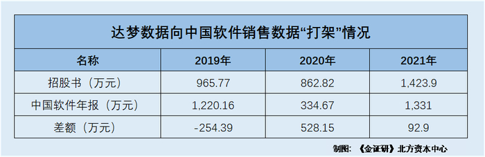 根据《金证研》北方资本中心研究,相较于中国软件年报披露的采购金额,招股书披露的达梦数据向中国软件的销售金额2019年少254.39万元、2020年多528.15万元、2021年多92.9万元。