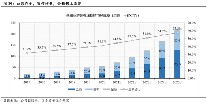 从岗位类型细分市场看有三大重要来源:存量白领市场基本盘份额的提升(抢其他平台的份额)、蓝领招聘线上化率提升驱动的增量市场、高端但规模较小的金领市场作为锦上添花。