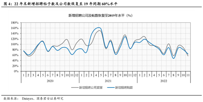 12月疫情阵痛期冲击下景气度。四季度为传统招聘淡季,且22年12月在疫情波动叠加阵痛期冲击下,企业用工需求景气度并未回暖。11月以来新增招聘公司帖子数和新增招聘公司数目前依然处于19年同期60-80%区间。