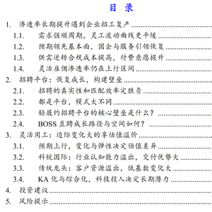 投资建议:人力资源服务将受益于经济预期回暖驱动的企业订单增加,以及专业化人力资源服务的付费意愿提升下,渗透率上行趋势。其中招聘赛道兼具模式、空间、大市值,推荐标的:BOSS直聘,同道猎聘;灵活用工景气度重回增长,国资龙头外延扩张预期足,灵活用工新业务边际变化大;而目前龙头科锐自身效率占优,行业与岗位资源积累优势足。推荐标的:科锐国际、北京外企。
