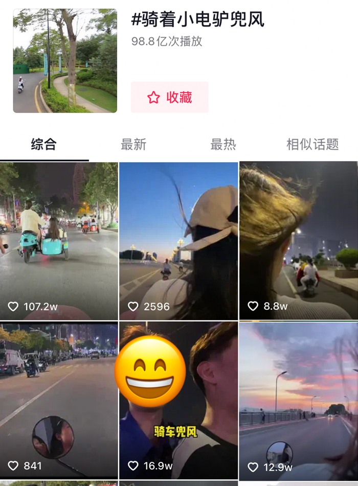 短视频平台上,#骑着小电驴兜风#达到98.8亿次播放,很多关于骑电驴有多欢乐的网络流行语也正在风靡当中——