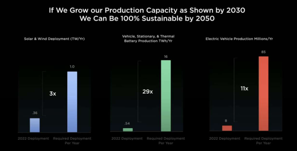 在今天的演讲中,马斯克终于给出了这条道路的具体细节:特斯拉未来将实现储能规模达到240TWH,可再生电力达到规模30TWh,在制造方面投资10万亿美元。