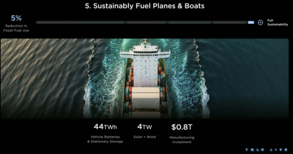 此外,未来使用再生燃料的飞机和电动船舶也会成为特斯拉实现可持续化的发力领域。