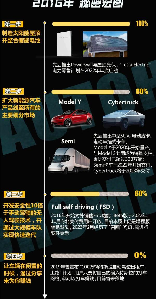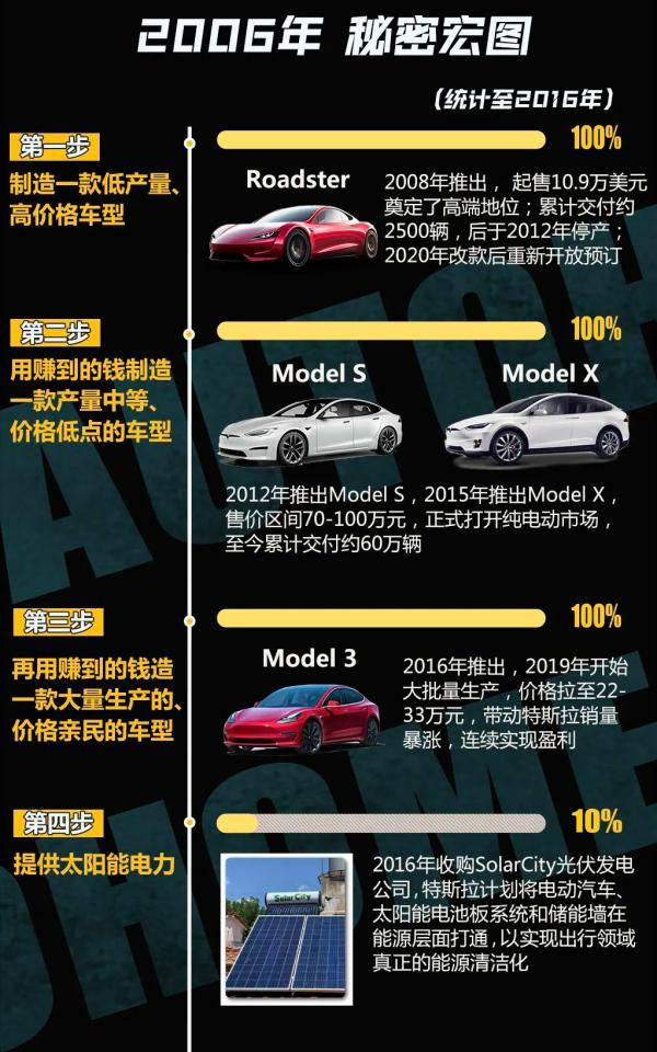 在2006年、2016年,马斯克分别发布了特斯拉宏图计划第一、二篇章,提出了打造电动汽车、提供太阳能电力产品、提供储能一体化方案、自动驾驶等设想,如今大都实现。这张神奇的蓝图一步步指引特斯拉到了今天的地位。