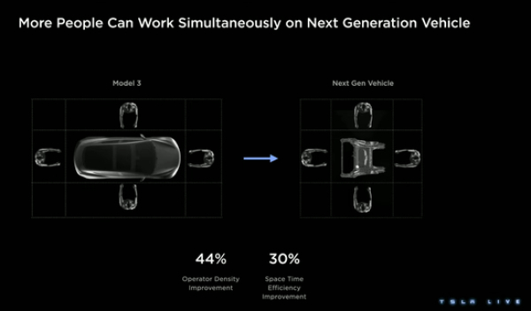 此外,弗兰兹·冯·霍尔扎和汽车工程副总裁拉尔斯·莫拉维介绍,特斯拉将推出下一代电动汽车制造平台,通过这个平台,电动汽车的组装成本降低50%。未来,特斯拉将会从Model Y开始减少零件数,实现一体化压铸,电池会成为车底盘的一部分,减少作业流程,提高时空效率。此外,这个新的平台将会将序列生产与序列组装平行结合,实现同步一次性组装,以此减少40%的生产占地面积,从而大幅减少资本支出,单车成本也可以降低。