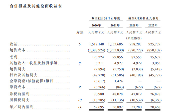 招股书显示,在过去的2020年、2021年和2022年前九个月,泛远国际的营业收入分别为15.12亿、13.54亿和9.26亿元人民币,相应的净利润分别为5,269.5万、3,689.2万和2,046.8万元人民币。