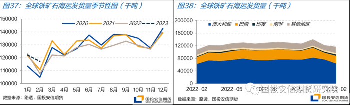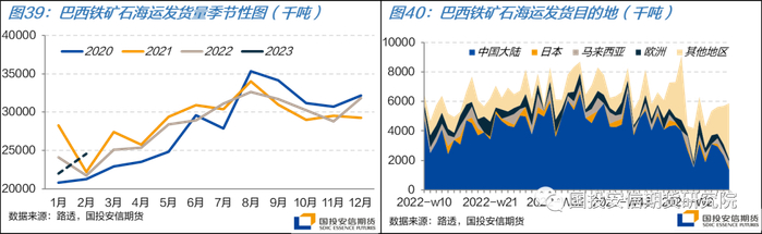 巴西铁矿石发运水平在1月受到其本国强降水影响和我国春节假期的共同影响,同环比都有明显的下滑,全月合计发货量为2201万吨。2月以来,随着我国复工节奏的加快,巴西铁矿石发货量逐周恢复,预计全月发货量将环比上升11%,且高于过往几年同期水平。若对比过往几年1~2月的累积发货(消除每年春节早晚不同对单月货量的影响),则比2022年同期水平高1.5%,较2021年同期低8%。目前巴西强降水已引发地质灾害,尽管尚未阻碍铁矿石发运产生,但需持续关注其对巴西铁矿石出口可能产生的影响。