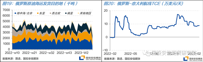 欧盟在去年12月开启对俄罗斯的原油制裁后,俄罗斯原油海运发货量不降反增,1月发货量合计2121万吨,飙升至历史新高。其中对我国单月出口大幅上涨至494万吨,较12月上升135万吨,而对印度的发货量也保持在历史高水平的498万吨。2月发货量有所回落,预计环比将下滑21%。本月上旬俄罗斯宣布将在3月减产大约5%,以对抗七国集团的价格上限,至月末更是有报道称部分地区出口降量可能会达到25%,主要针对前往欧洲地区的石油,或将一定程度上对区域内运力需求造成影响。