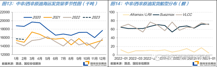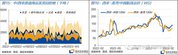 年初在我国需求的带动下,西非发货量延续了2022年末的较好水平,1月发货量1576万吨,与去年12月基本持平,同比上升6%。2月的发货量预计环比将小幅下滑1%,但同比仍有11%的增幅。2月初西非货量的下滑和美湾市场的疲软也使得运价承压下行,但月中3月货盘逐步放出,加之美湾市场较好的发运节奏对西非市场运力的吸收,西非相关航线运价上行。截至月末,西非-中国运价自月内低点上涨18%,西非-美湾则上涨9%。