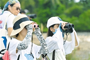 每年春季,数以万计的鸟儿在海口的小区、公园、湿地活跃,奏响人与自然和谐之曲。3月1日,海南东寨港国家级自然保护区管理局林业工程师冯尔辉向记者介绍,海口常见的鸟类有白鹭、珠颈斑鸠、池鹭、牛背鹭、褐翅鸦鹃、白头鹎、棕背伯劳、丝光椋鸟、八哥、白胸苦恶鸟、黑喉噪鹛等。随着喜欢观鸟、爱鸟、护鸟的人群越来越壮大,为让更多市民欣赏到周边的鸟类资源,冯尔辉专门为大家绘出海口湿地“观鸟地图”。