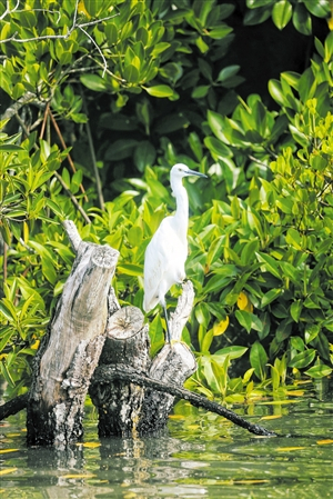 塔市湿地接连着琼州海峡,有着连片面积大、景观美的原生态红树林。每当海水退去后,泥滩裸露出来,留在光滩上的鱼虾尽情舞蹈。这也是鸟儿粉墨登场的最佳时机,白鹭悠闲迈着长腿觅食,青脚鹬和红脚鹬竞相奔跑,也能看见一两只吃饱了肚子,却在“kue,kue,kue”作叫的白胸苦恶鸟。每年如约而至的丝光椋鸟,傍晚归林的场景犹如川河汇海,波涛汹涌,形成“万鸟归巢”的壮观美景。