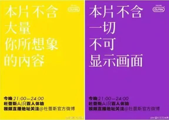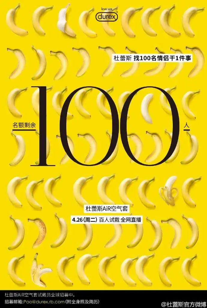 或许有人还记得杜蕾斯在2016年策划的一场“百人试套,全网直播”的活动,直播前期在网络上征集50对情侣打出了“找100名情侣,干1件事”的口号,把人们的好奇心拉满了。