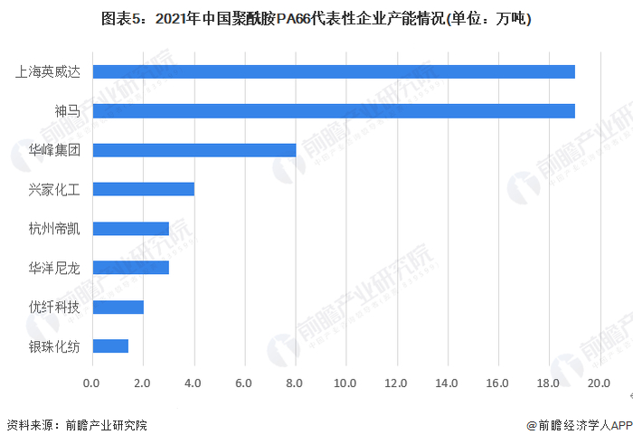 2021年,上海英威达与神马股份聚酰胺PA66产能最多,均为19万吨;排名第三的为华峰集团,产能为8万吨,第四为兴家化工,产能为4万吨。